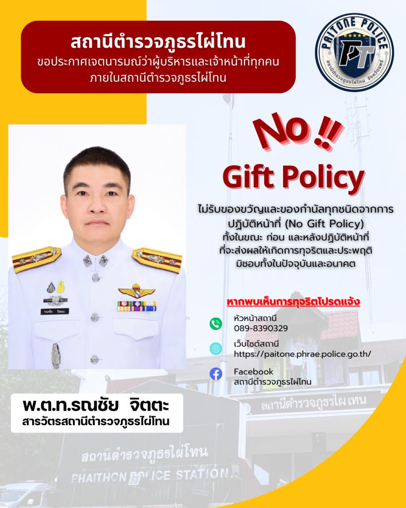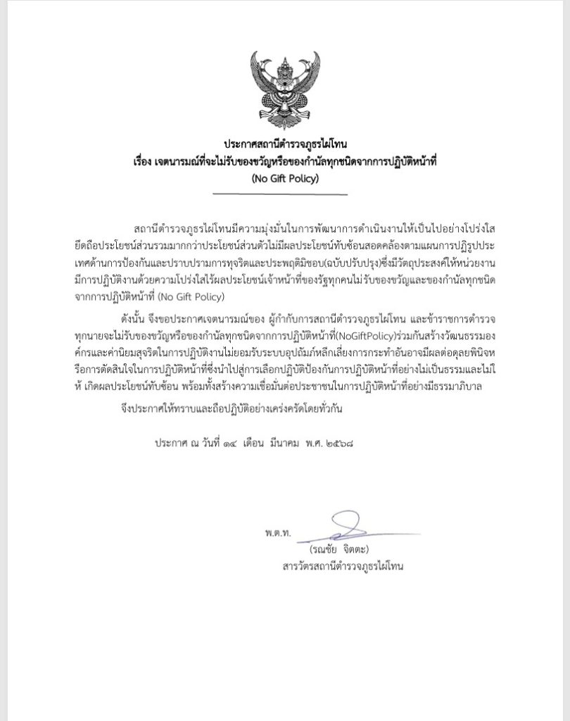 - ประกาศสำนักงานยุทธศาสตร์ตำรวจเรื่องเจตนารมณ์ที่จะไม่รับของขวัญหรือของกำนัลทุกชนิดจากการปฏิบัติหน้าที่