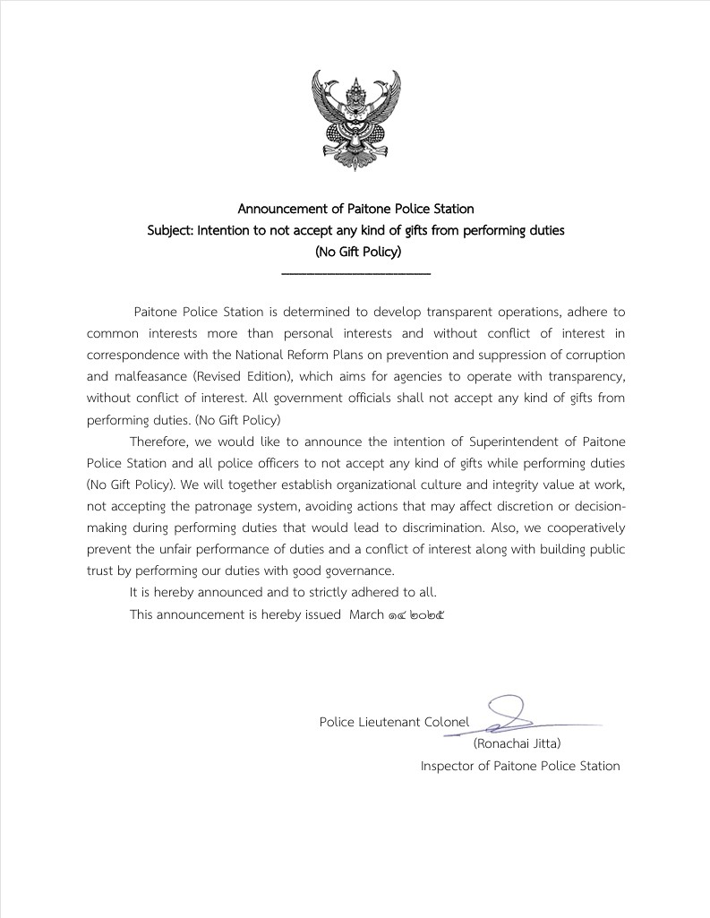 การดำเนินกิจกรรมการมีส่วนร่วของหัวหน้าสถานีตำรวจในการต่อต้านการทุจริต/การรับสินบน สถานีตำรวจภูธรไผ่โทน ปีงบประมาณ 2568